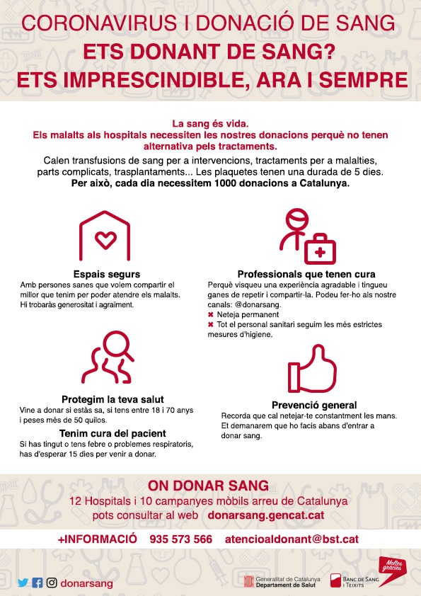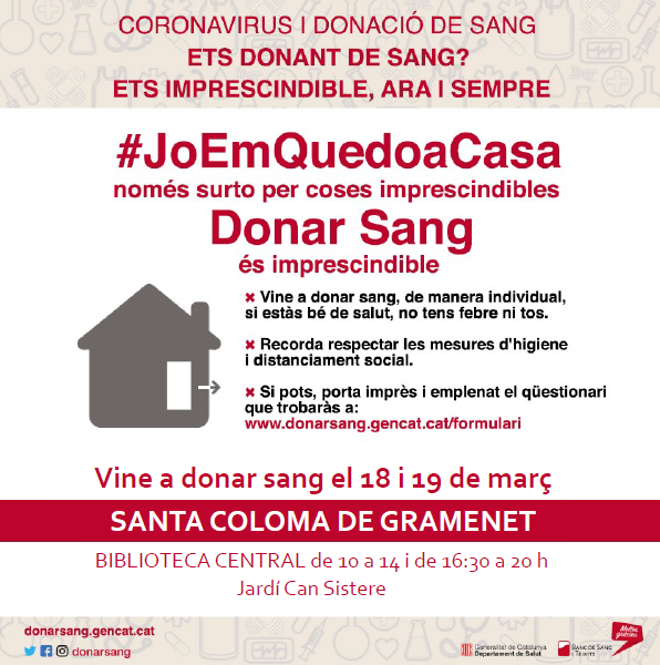 El tancament dels centres educatius ha obligat a suspendre la campanya de donació de sang prevista a Les Vinyes. Les persones interessades podeu participar, seguint les recomanacions sanitàries, en l'acte següent: