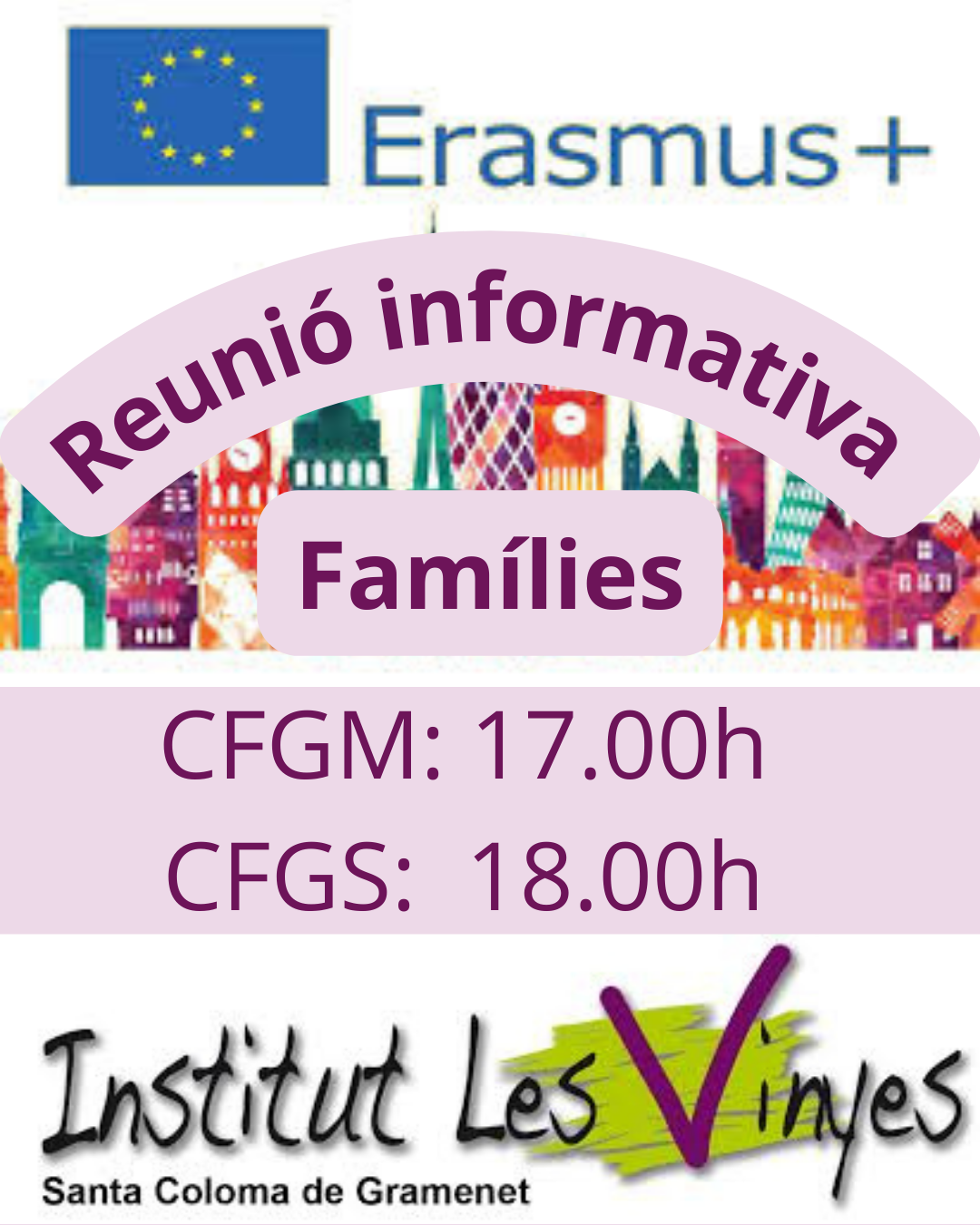La reunió informativa per a les famílies interessades en les mobilitats Erasmus+ es realitzarà dimecres 17 a les 17.00h hores per als CF de grau mitjà i a les 18.00h per als CF de grau superior.