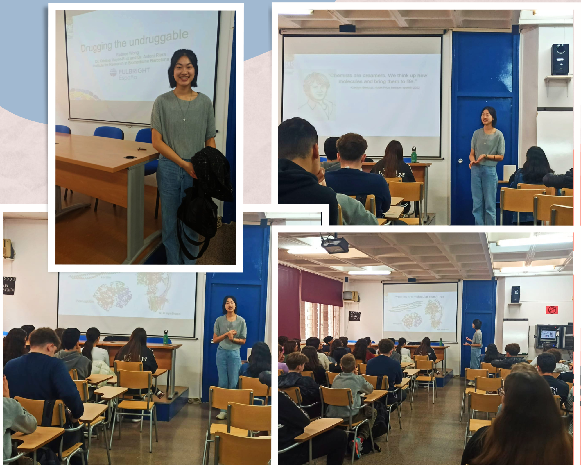 El passat divendres 17 de març, la Sydnee Wong, una investigadora americana que forma part del programa d’excel·lència Fulbright, va fer una xerrada a l’alumnat de 1r i 2n de Batxillerat. En primer lloc, va explicar la seva trajectòria acadèmica, des dels inicis fins a la universitat. Després, va aprofundir en la seva recerca actual: la degradació de proteïnes dirigida com a teràpia contra el càncer. Finalment, vam poder gaudir d’un animat debat entre ella i l’alumnat assistent.
